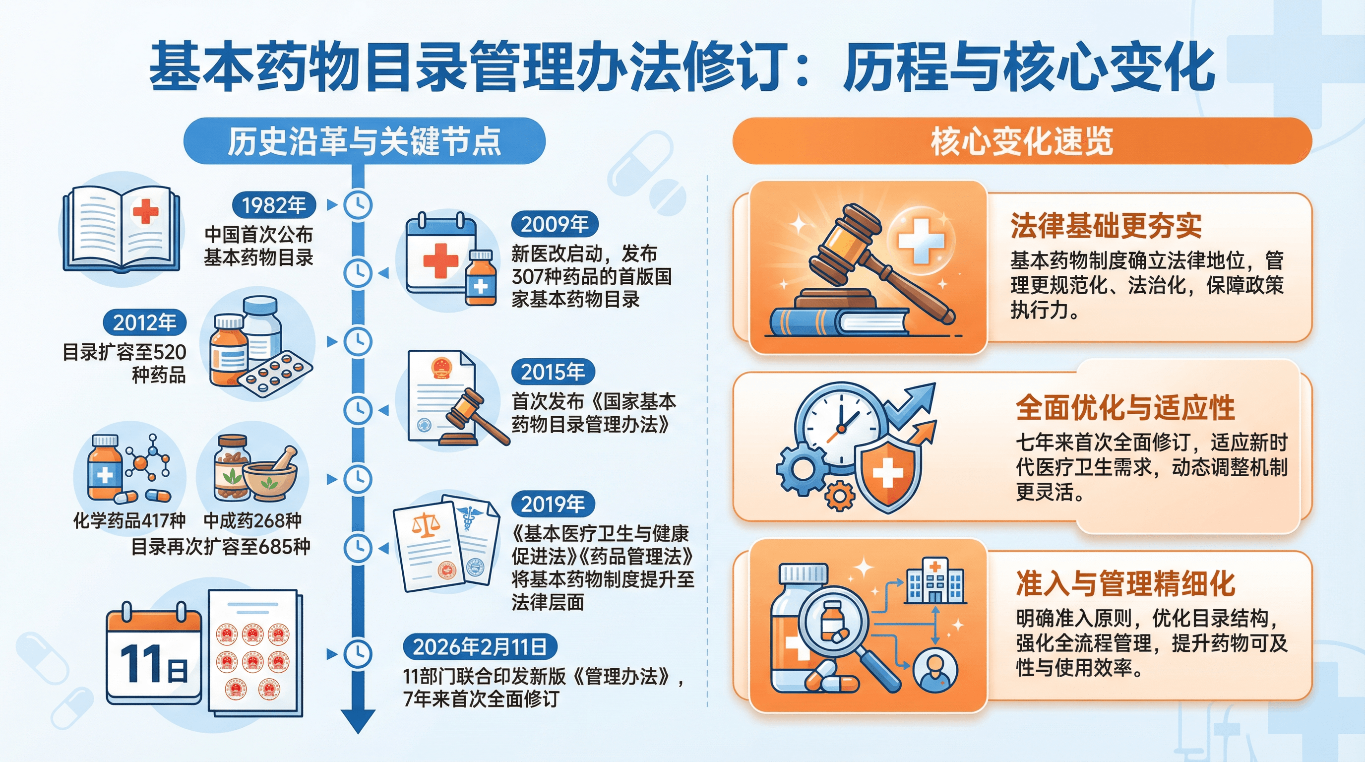这一困局或将改变。2026年2月11日,国家卫生健康委联合国家发改委、工信部、财政部、商务部、市场监管总局、国家医保局、国家中医药局、国家疾控局、国家药监局、中央军委后勤保障部等11部门印发《国家基本药物目录管理办法》(国卫药政发〔2026〕2号),为沿用7年之久的管理机制按下"重启键"。