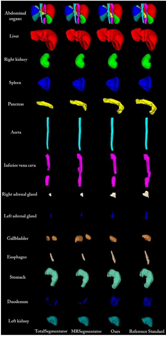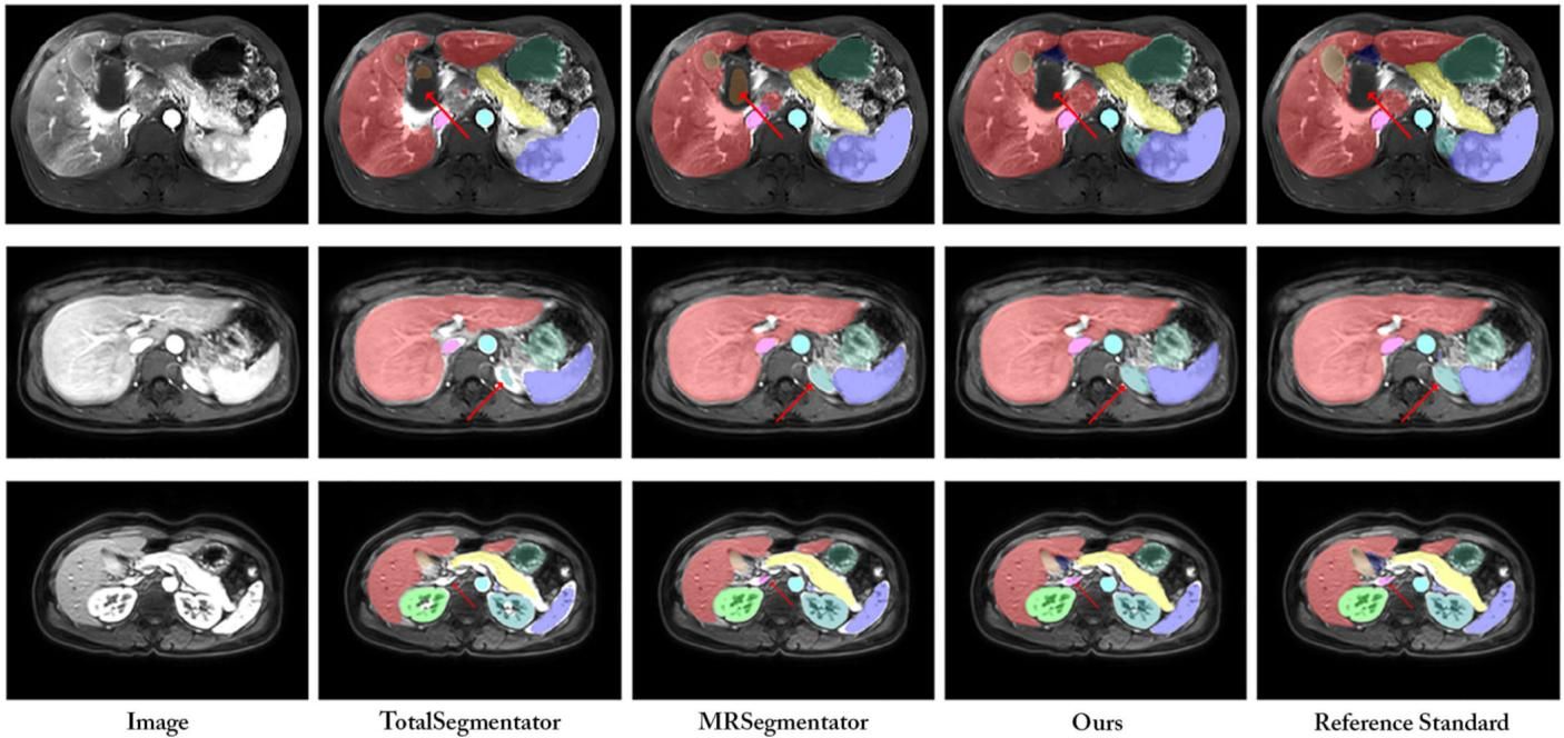 为了验证这套“特训”方法到底有没有用,研究团队找来了两位重量级的“对手”进行比拼:TotalSegmentator 和 MRSegmentator。这两位在医疗AI界可是大名鼎鼎的“顶流”,它们也是基于先进架构开发,并且使用了成千上万张真实的CT和MRI扫描图进行训练,可谓见多识广。