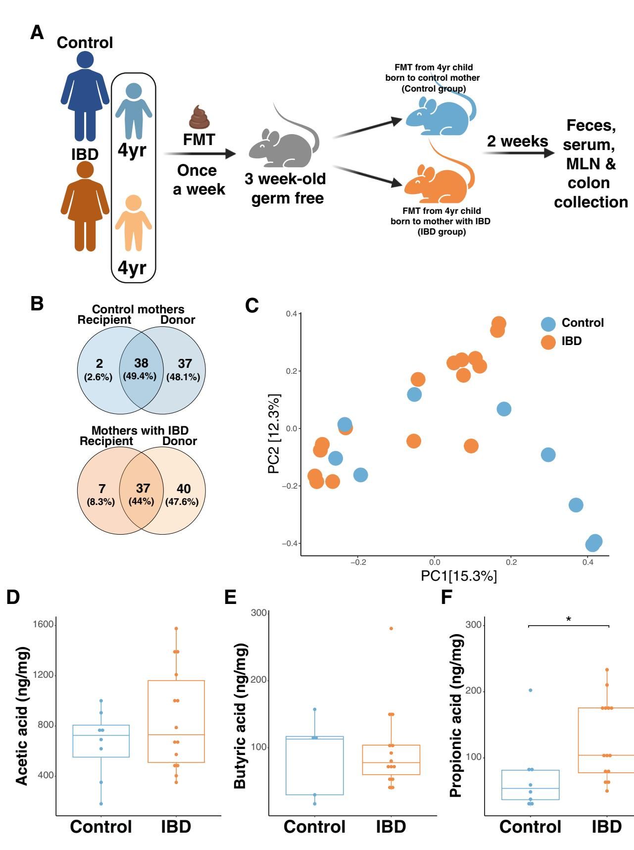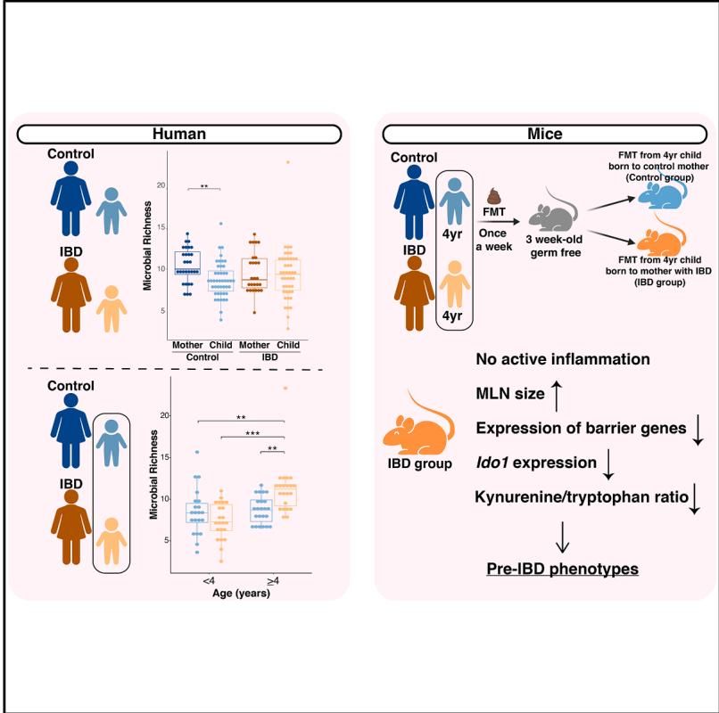 他们选取了4岁组儿童的粪便样本——一组来自IBD母亲的孩子,一组来自健康母亲的孩子——并将这些样本移植到了无菌小鼠体内。这些小鼠就像一张张白纸,它们身体的反应将直接反映出菌群的作用。
