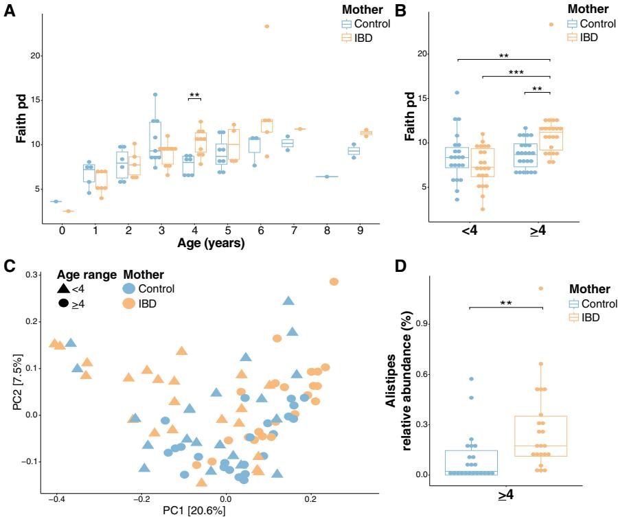 如图[2]的A图和B图所示,我们可以清晰地看到,随着年龄增长,两组儿童的菌群多样性(Faith pd指标)都在上升,但在4岁这个节点之后(图中$≥4$的部分),IBD组儿童(橙色)的菌群特征开始与健康对照组(蓝色)表现出显著的统计学差异。这暗示着,母亲疾病对孩子菌群的深远影响,可能要在菌群发育成熟后才会完全显露出来。