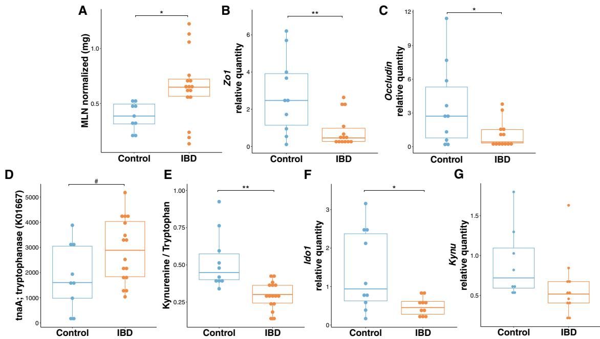 然而,在移植了“IBD二代”菌群的小鼠体内,情况发生了逆转。如图[4]所示,这些小鼠肠道中Ido1酶的表达量显著降低(图F),导致犬尿氨酸与色氨酸的比值大幅下降(图E)。这就像是身体里的“维和部队”被削减了编制,一旦有冲突发生,身体将更难平息战火。