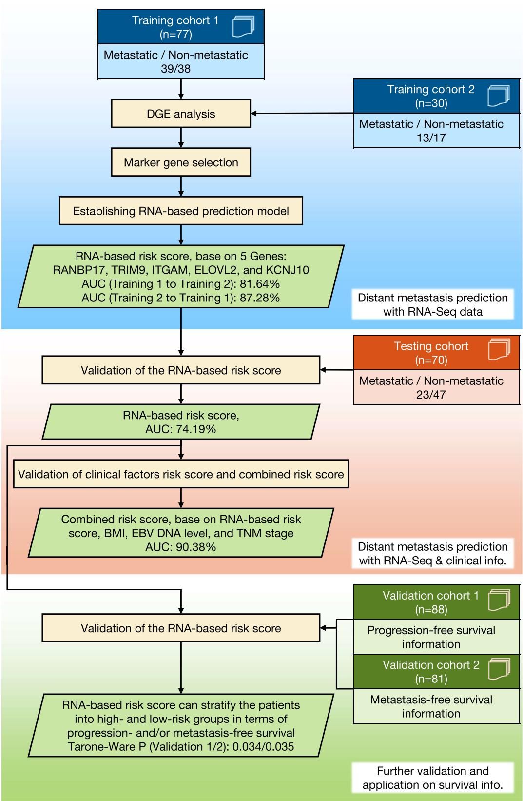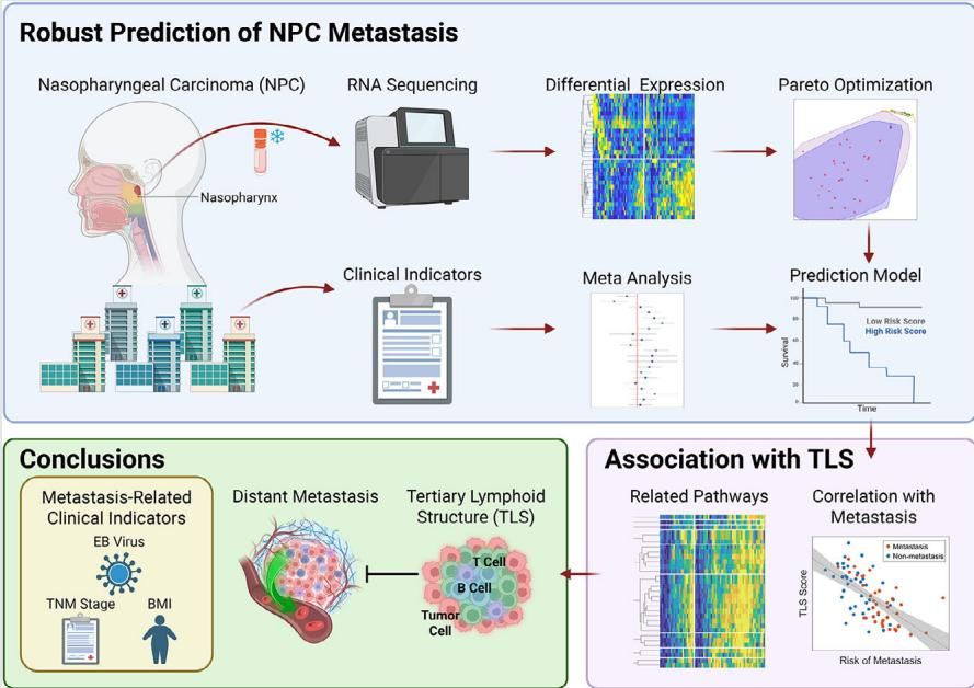 传统的临床指标(如TNM分期、EB病毒DNA水平)虽然有用,但常常出现“漏判”或“误判”。为了解决这个难题,来自香港大学和中山大学肿瘤防治中心的研究团队联手进行了一项重磅研究。如图[1]所示,他们利用先进的RNA测序技术,在基因层面找到了一把“新标尺”,不仅揭示了癌细胞转移的秘密,更将预测的准确度(AUC)提升到了惊人的90.4%。