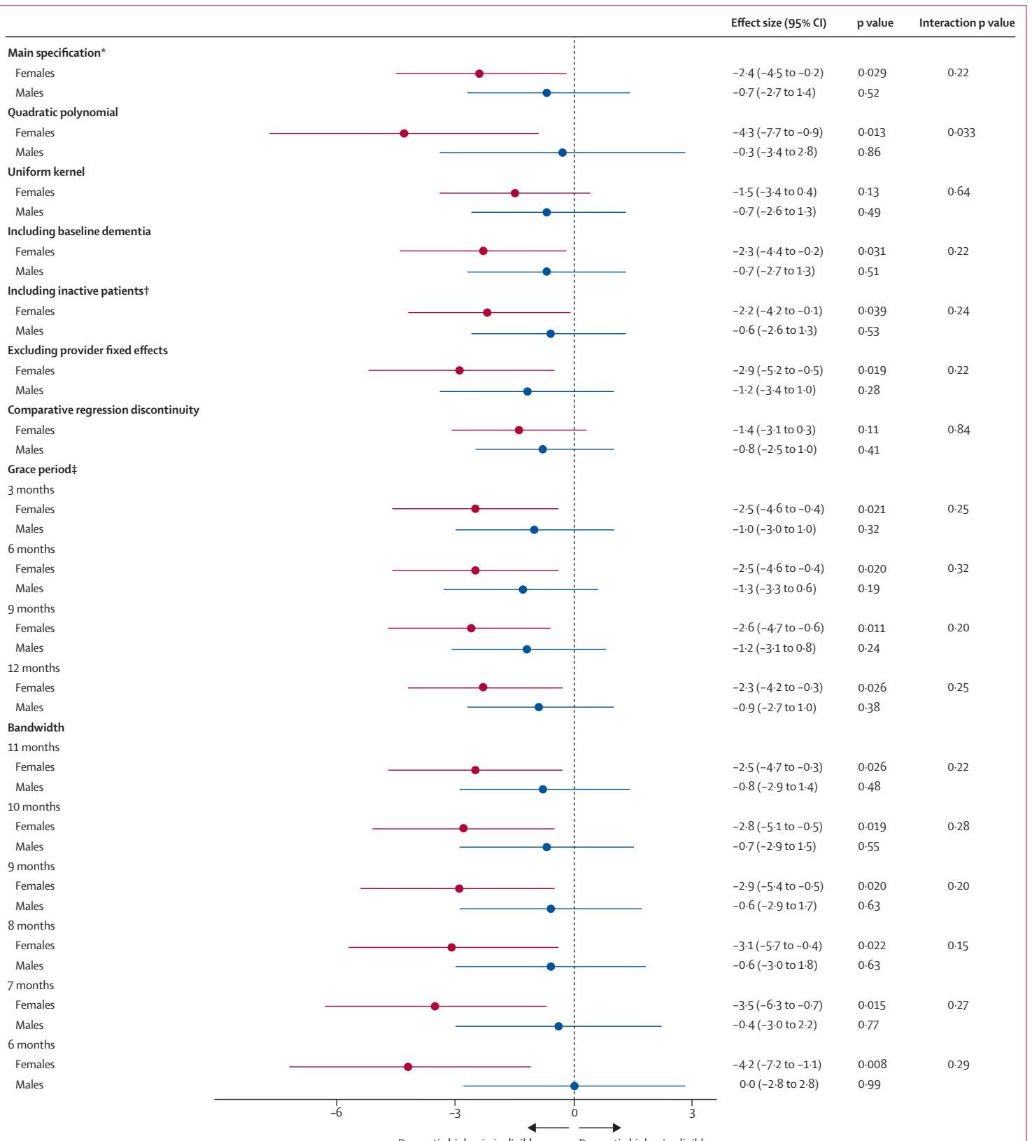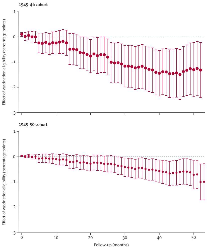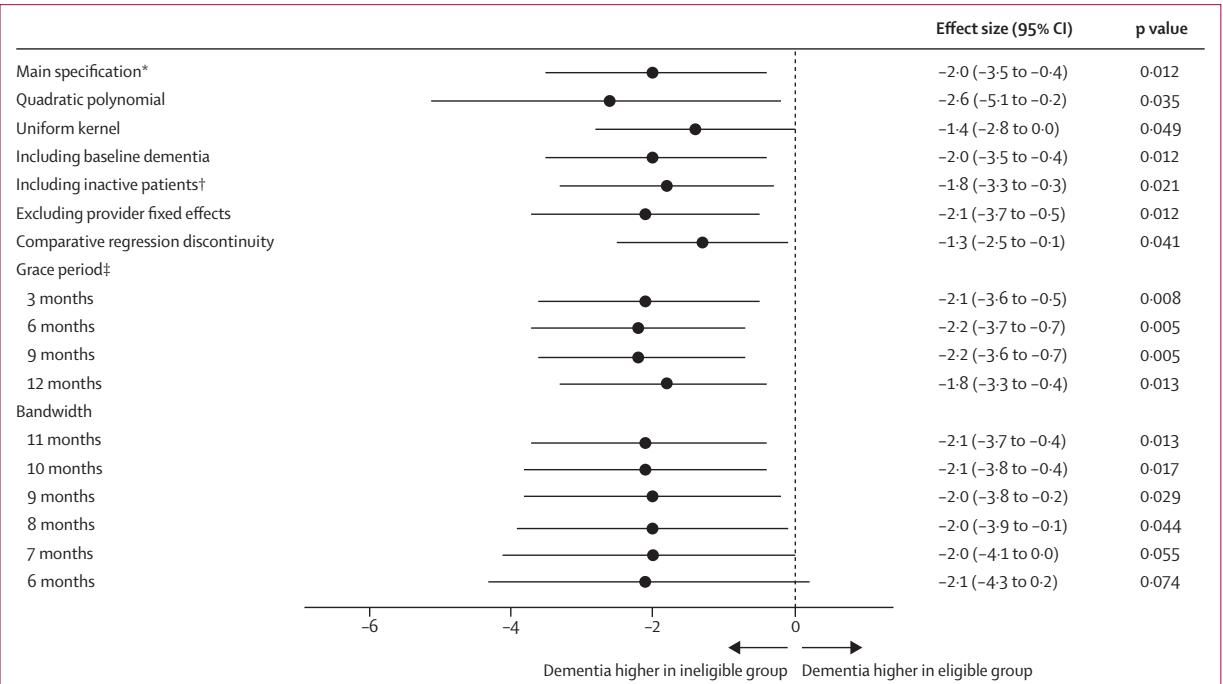 图[2]描绘了疫苗接种资格对痴呆发病率随时间推移的影响。我们可以看到: