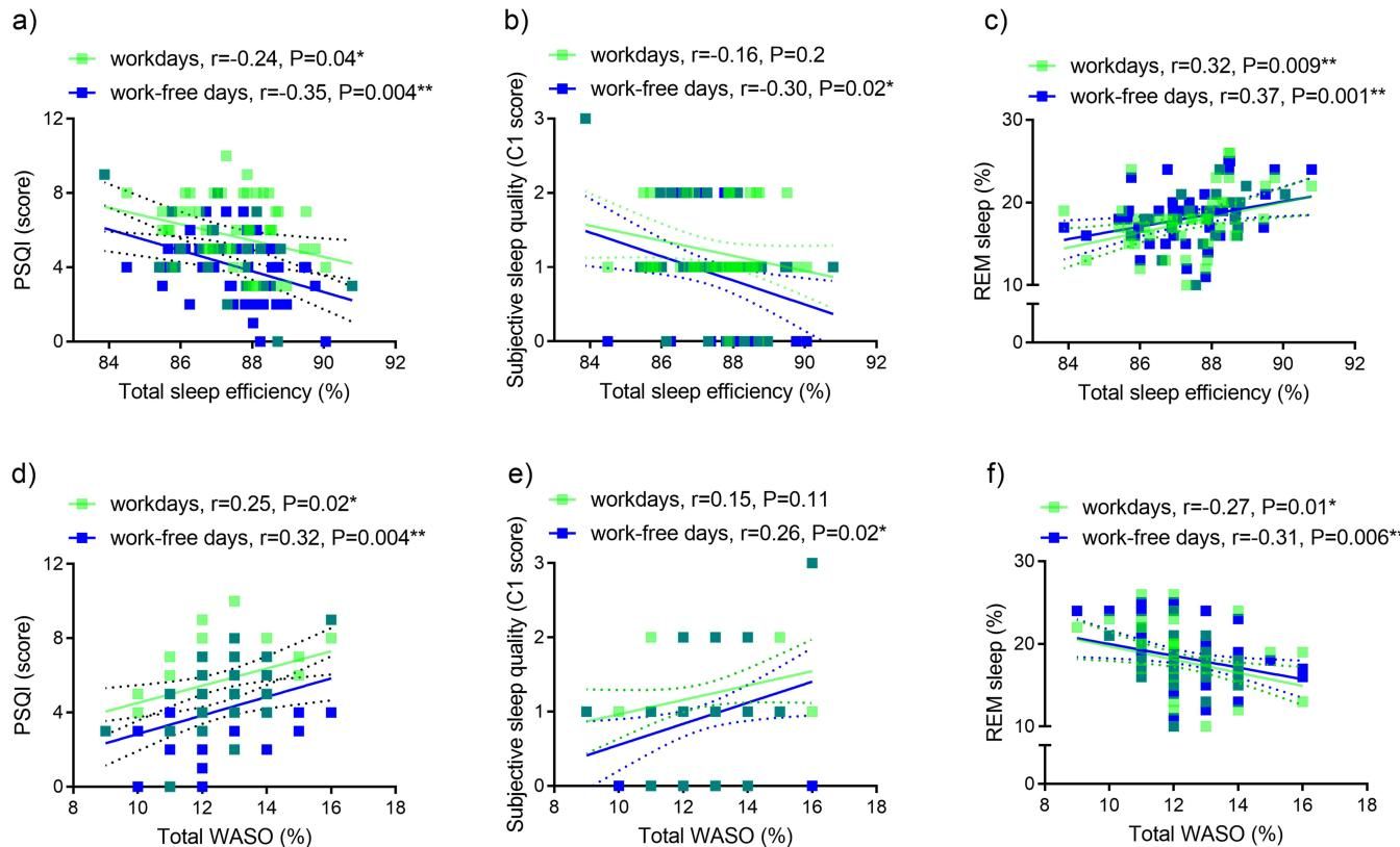 数据揭示了一个简单而深刻的道理:高质量的睡眠必须是高效且连续的。如图[3]所示,睡眠效率越高,你的睡眠评分就越好(图[3]a、b),不仅主观感觉更解乏,连主要反映心理恢复的REM睡眠比例也会随之上升(图[3]c)。相反,如果你半夜频繁醒来(WASO增加),即便躺够了8小时,你的主观睡眠质量也会大打折扣(图[3]e),甚至会直接导致REM睡眠比例下降(图[3]f)。