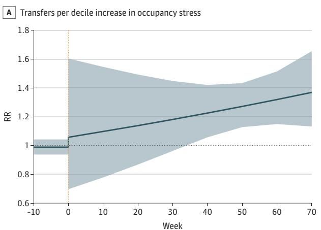 在那个最初的 35% 激增之后,随着时间推移,在医院床位压力不大的“平时”,转运率实际上出现了轻微的下降。这其实很符合常理——当病床不紧张时,医生之间打个电话就能解决问题,此时如果非要经过一道行政审批手续,反而可能降低效率。